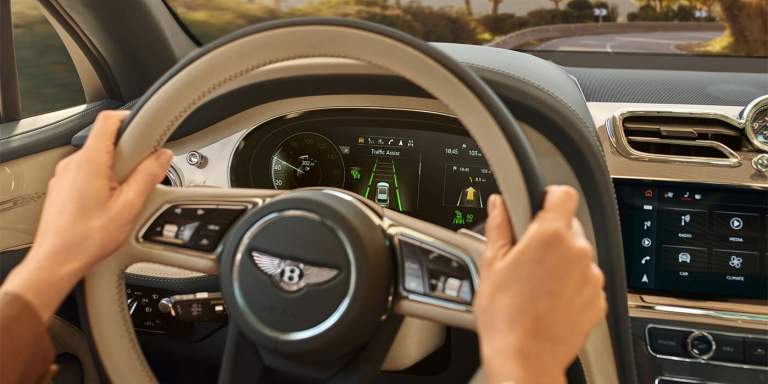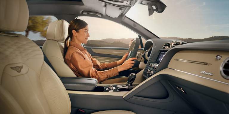 ベントレー ダイナミック ライドのアンチロールシステムは、コーナリング中にキャビンを安定させ、高速道路では快適性を高めてくれます。AWS(全輪操舵)の効果により、新型ベンテイガEWB アズールは想像以上の取り回しの良さを実現しています。