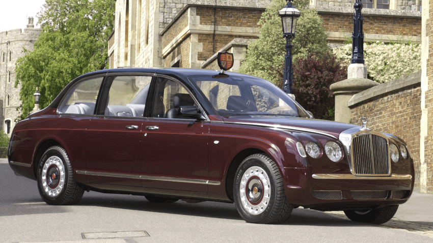 エリザベス女王陛下の即位50周年を記念して製造された、女王陛下専用のステートリムジンは、クラシックなベントレー アルナージのホイールベースを延長して製造された車両です。しかし、ホイールベースの延長はあくまでも1つの要素に過ぎません。女王陛下が快適に、そして威厳を保ったまま乗り降りできるように、ベースモデルであるアルナージよりも全幅を広げ、全高は高く設計されました。リアドアのヒンジは後部に設けて観音開きとし、開口角度も90°を確保しています。また、女王陛下や運転手を保護するために、大幅な安全対策が施されています。